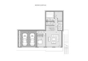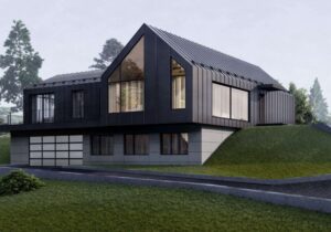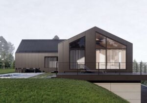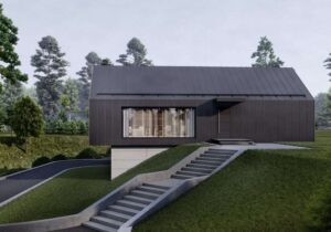 This home exemplifies a harmonious blend of minimalist architecture and modern functionality, designed for both comfort and elegance. The striking dark exterior contrasts beautifully with the lush greenery, creating a bold yet inviting facade. Large windows seamlessly connect the interior to the natural surroundings, ensuring ample natural light and stunning views from every room.
