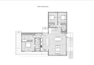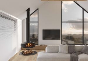 Inside, the layout emphasizes clean lines and open spaces, with thoughtful touches that elevate daily living. The living room, complete with a sleek, hanging fireplace, offers a cozy and sophisticated retreat with expansive glass walls framing picturesque vistas. Adjacent to the living area, the dining and kitchen spaces are adorned with modern finishes, including high-end cabinetry and premium lighting fixtures, all tailored to suit the homeowner’s preferences. The home’s HVAC system ensures optimal climate control, while the design team pays meticulous attention to detail, accommodating personalized requests to align with the homeowner’s vision.