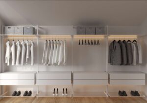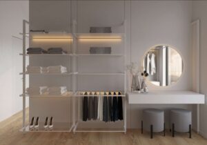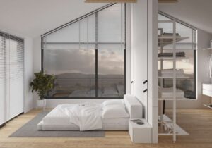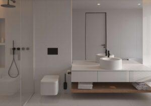 The master bedroom presents a serene escape, enhanced by panoramic windows and natural wood accents, creating a tranquil atmosphere. Adjacent is a walk-in wardrobe that seamlessly blends practicality with modern design, offering abundant storage and a chic vanity area. The bathroom reflects spa-like luxury, featuring minimalist fixtures, a spacious walk-in shower, and a sleek vanity.