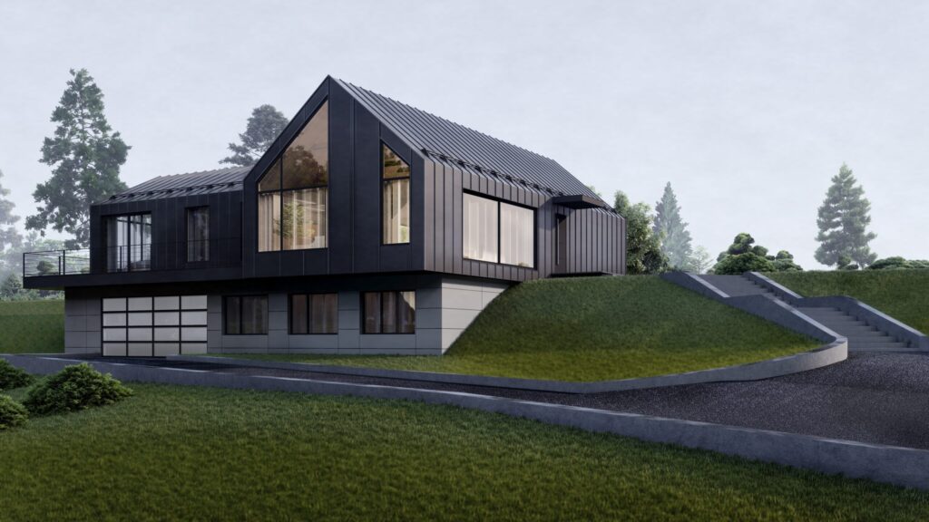 This modern home combines bold design with everyday comfort. Dark paneling, clean lines, and large windows connect the interior with nature, filling the space with light and scenic views. Inside, the open layout features high ceilings with wood accents, a built-in fireplace, and modern lighting that create a warm, inviting atmosphere. The kitchen is both […]