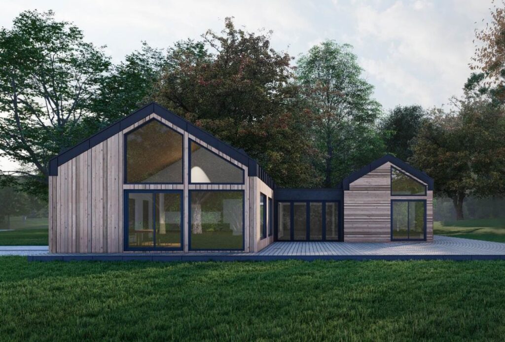 This two-bedroom flat house brings together modern design and practical comfort. The bold black roofline paired with warm wood cladding creates a balanced look that feels both contemporary and connected to nature. A spacious deck extends the living area outdoors, perfect for relaxing or entertaining. Inside, the open layout combines a modern kitchen with quality […]