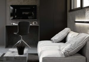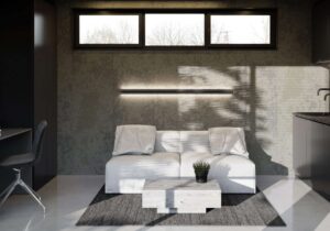 Inside, the layout is flexible and inviting. The bedroom offers a calm, quiet retreat with floor-to-ceiling windows that frame peaceful outdoor views. The living area flows easily between relaxation, work, and entertainment, while the kitchen features modern cabinetry, energy-efficient lighting, and an integrated HVAC system for year-round comfort.